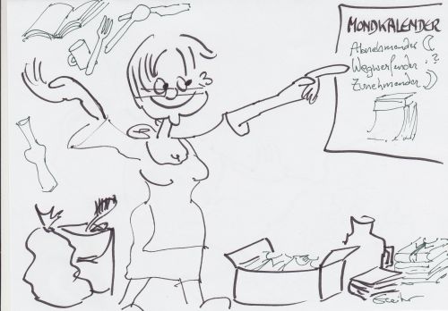 also meine erfahrung sagt, dass du bei solchen aktionen GAR NICHT auf irgendwelche theoretisch im kalender ixierten (mond)phasen achten darfst, sondern gleich des morgens oder tagsüber merkst, dass es ein solcher tag ist. und wenn der dann gekommen, dann muss man ihn ausnutzen und einfach rigoros alles was man seit 2 jahren nicht in den händen hatte wegwerfen, den schwarzen (!!! unbedingt schwarz und nicht durchsichtig, denn sonst sieht man all das weggeworfene durch den sack und beginnt wieder zu überlegen) sack wenn man fertig ist, oder die phase nachlässt SOFORT zubinden und in die mülltonne tragen.